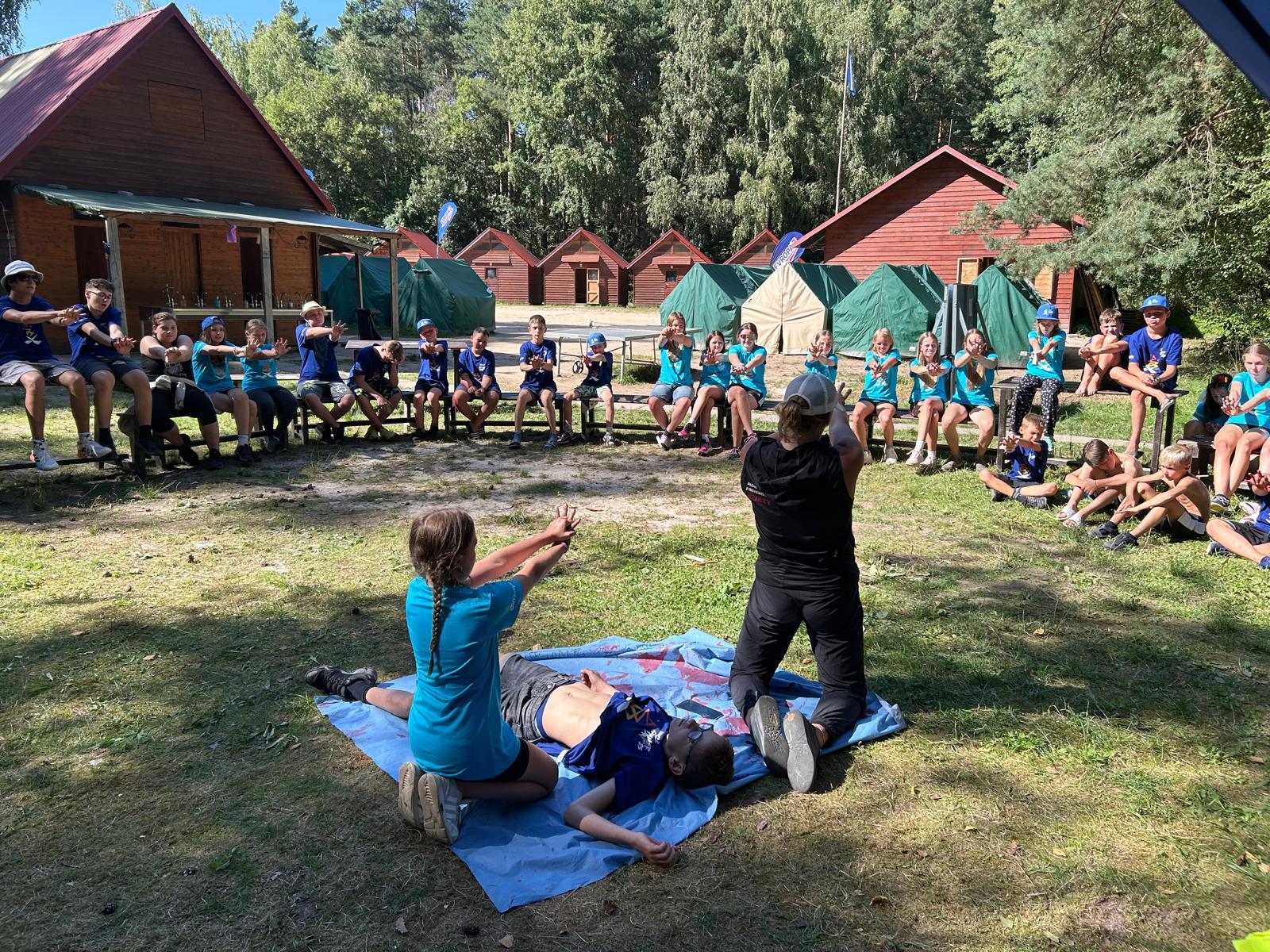 Pedagogický sbor si vyzkoušel realistické situace první pomoci, včetně ošetřování poranění, scénáře pokousání psem a maskování zranění, a současně si procvičil rychlou reakci v akčních, běhavých cvičeních.
